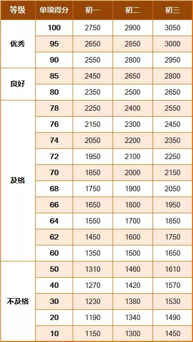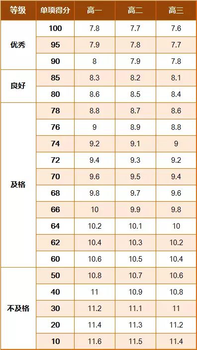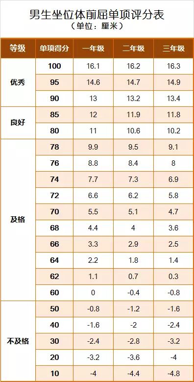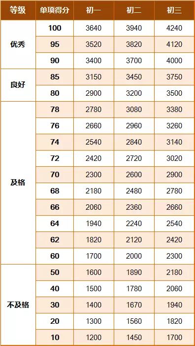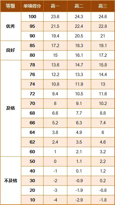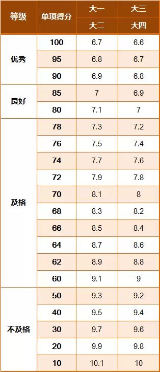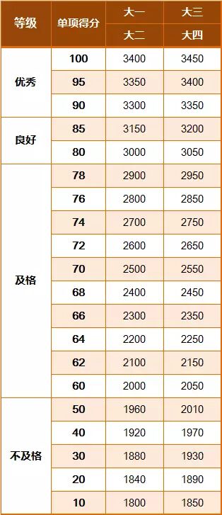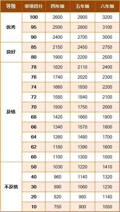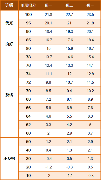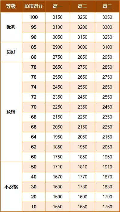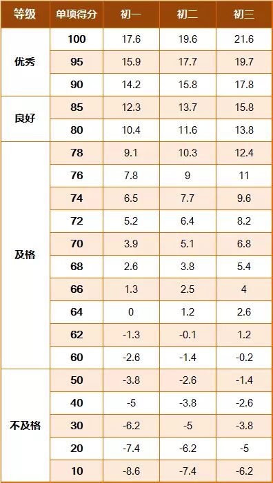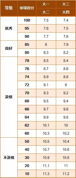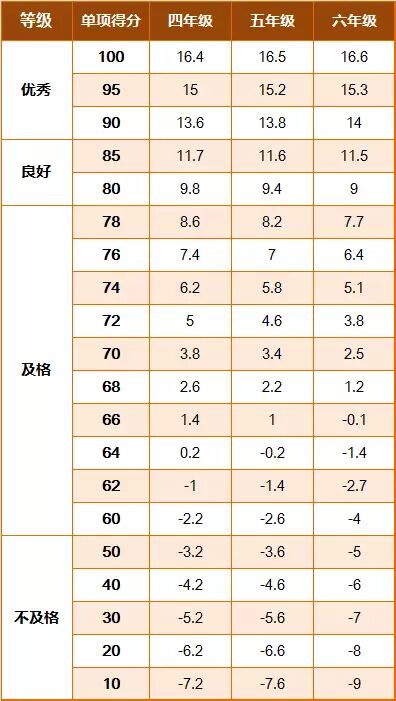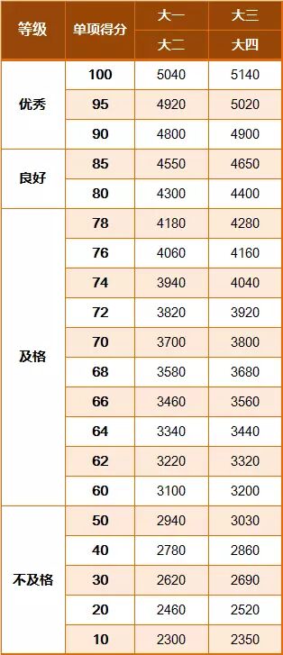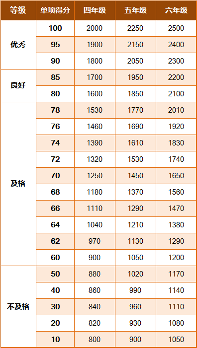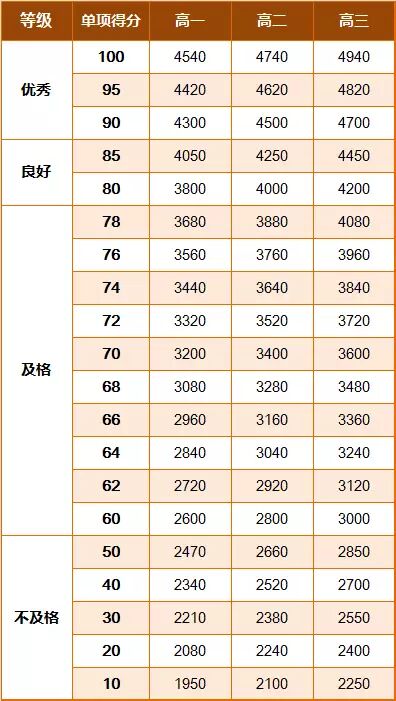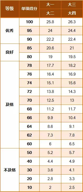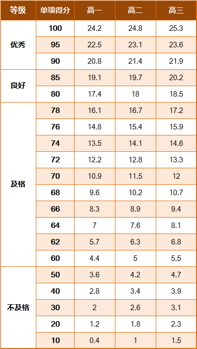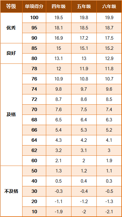 《标准》的学年总分由标准分与附加分之和构成,满分为120分。根据学生学年总分评定等级:90分及以上为优秀,80-89.9分为良好,60-79.9分为及格,59.9分及以下为不及格。《标准》同时规定,学生测试成绩评定达到良好及以上者,方可参加评优与评奖;成绩达到优秀者,方可获体育奖学分。测试成绩评定不及格者,在本学年度准予补测一次,补测仍不及格,则学年成绩评定为不及格。普通高中、中等职业学校和普通高等学校学生毕业时,《标准》测试的成绩达不到50分者按结业或肄业处理。